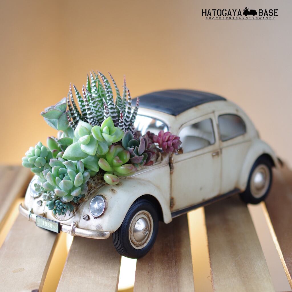 フォルクスワーゲンのミニカーに多肉植物を寄せ植えしたインテリア小物です。